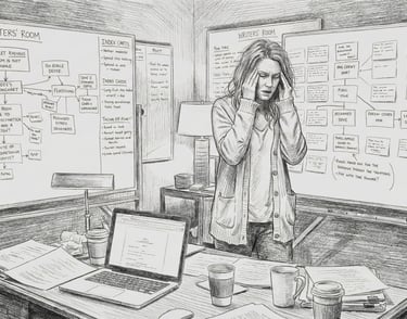 MIA sits over a messy desk, redrafting the final scene of a pilot.
